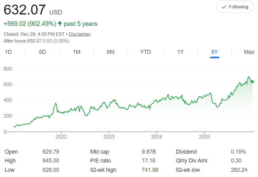 Five years ago, Dillard's Inc. (DDS) shares were trading around $69 each. Today, it's closed at $632.07—a stunning 902% surge that highlights its success in upscale department stores, with strong sales in fashion, beauty, and home goods despite retail challenges. The chart tells a story of steady growth from 2022 lows, with real acceleration in 2024-2025, and a 52-week high of $741.98 showing the peak appeal so far.