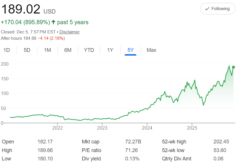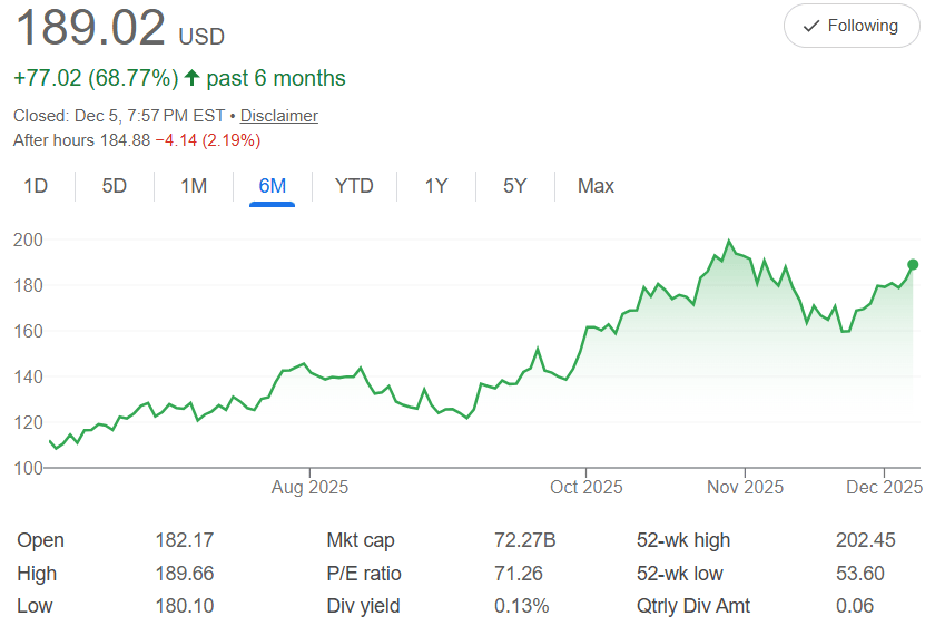Five years ago, Vertiv Holdings Co. (VRT) shares were trading at about $18.17 each. Today, it's closed at $189.02—a whopping 895% leap that powers ahead on the AI and data center boom, with cooling and power solutions in high demand as tech giants scale up. But let's look at the six-month chart for the honest ride: Kicking off July around $70, it rocketed to peaks near $100 in September on earnings wins and AI hype, then pulled back through October-November lows around $80 amid market jitters or sector rotations, before steadying for a net 25% gain overall. Pre-market at $188.88 shows the dip, but the rebound underscores resilience—with the 52-week high of $202.45 still in sight and low at $53.60 a thing of the past, it's a classic case of short-term noise in a long-term uptrend.