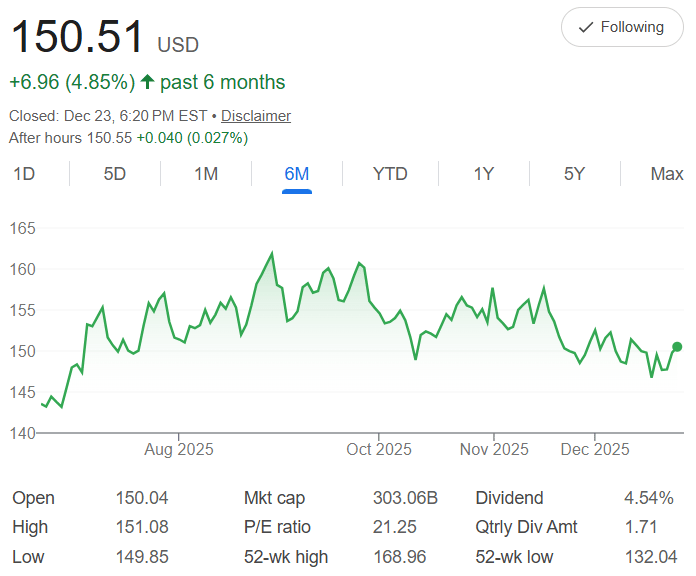 Five years ago, Chevron Corporation (CVX) shares were around $110 each. As of December 19, 2025, it's at $147.75—a reliable 34.15% gain from its integrated operations in exploration, production, refining, and chemicals, providing energy worldwide with a focus on efficiency and lower-carbon initiatives. Now, examine the six-month chart for the practical view: Starting August near $150, it pushed to October highs around $160 on solid earnings and oil stability, then eased through November-December to today's levels amid broader energy sector pressure or commodity fluctuations, netting a small 0.61% gain. That mid-period dip from $160 to $145 is typical short-term noise—perhaps from oil price swings or market sentiment—but the overall hold shows endurance, with the 52-week high of $168.96 already achieved and low at $132.04 not too distant.